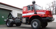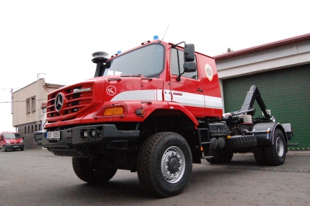 Požární kontejnerový nosič s hydraulickým jeřábem na podvozku Mercedes-Benz Zetros je vhodný do nejobtížnějšího terénu. PKN splňuje podmínky pro přepravu nebezpečných látek. Tento nosič umožňuje přepravu a manipulaci požárním kontejneru.